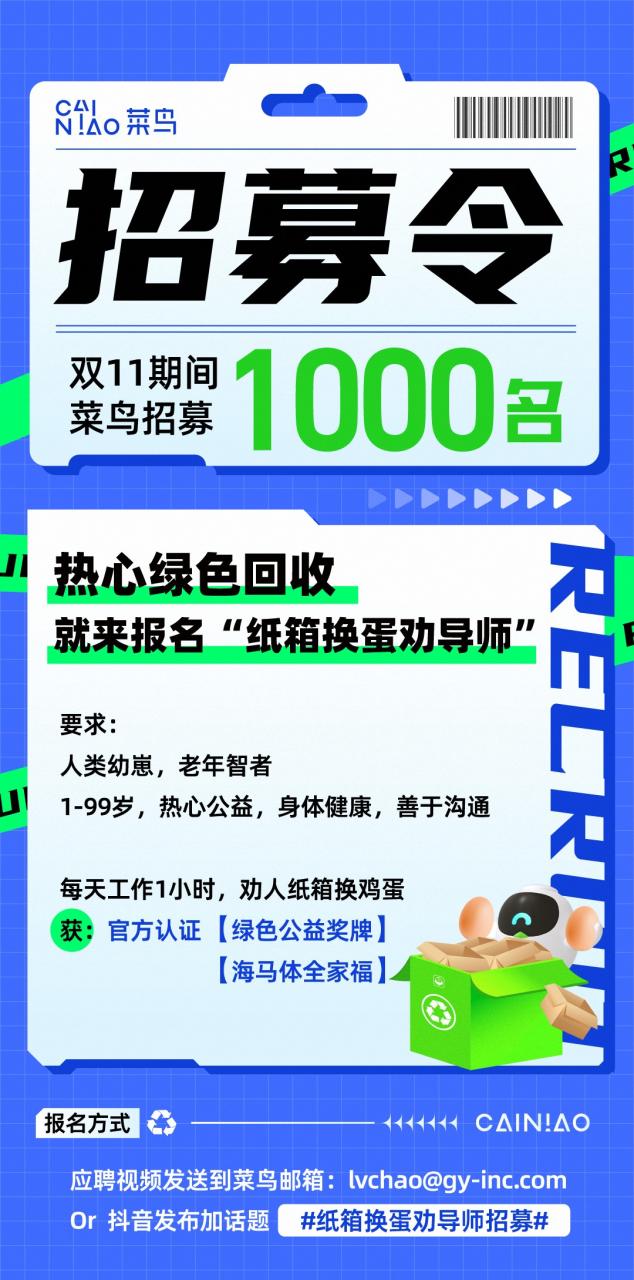 为了打消大家的疑虑,菜鸟希望通过招募官方认可的“纸箱换蛋劝导师”,在驿站现场为消费者普及环保知识,协助消费者参与绿色回收。