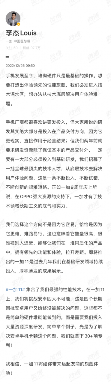 一加 11作为一加全新战略布局下的首款旗舰产品,也是一加要“做好产品”的最新诠释。此前周年庆上,一加宣布了一系列新举措:OPPO将开启“护航计划”,未来三年为一加单独投入100亿,主要用于产品研发。为此一加未来核心将是做好产品,即极致性能、质感设计、以及真正的旗舰体验。为做好产品一加可以不惜成本,未来三年内硬件综合净利润率可以为0。即将发布的一加11将秉承上述产品理念,展现一加过去几年来在基础研发领域厚积薄发的成果,挑战安卓四大不可能。