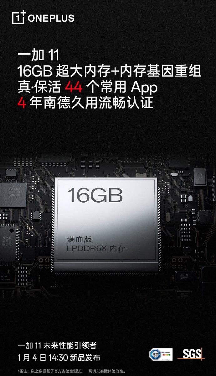 一加一直以来都是行业大内存的引领者,持续为用户提供极致流畅的大内存体验。此前推出的一加Ace Pro大内存版本就倍受欢迎,超80%的用户选择 16GB 版本。即将发布的一加 11集合了一加研发团队及 OPPO 研究院多项领先技术,以最强的性能技术挑战“安卓四大不可能”。为解决安卓卡顿问题,一加 11在大内存硬件的基础上更进一步,深入安卓底层进行重构优化,搭载独家自研内存基因重组技术,为用户提供持久流畅的使用体验。凭借领先的内存管理技术,一加 11 获得南德 48 个月久用流畅认证。