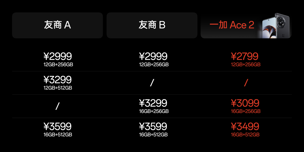 一加 Ace 2 16GB + 256GB 版本,售价3099元;