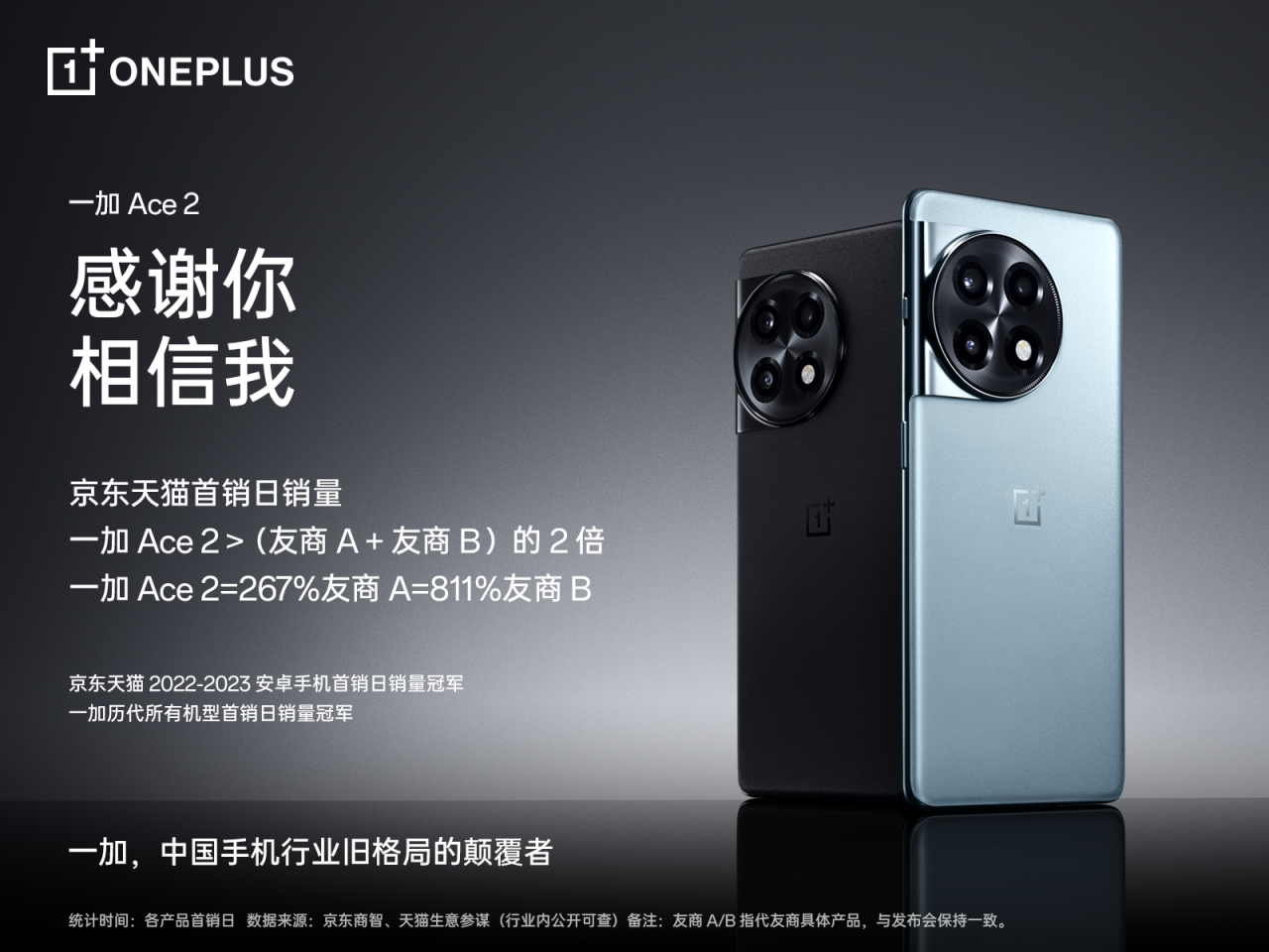 2月14日,一加中国区总裁李杰公布了一加Ace2首销成绩。一加 Ace 2 在京东天猫双平台首销日销量,超友商A+友商B日销量2倍,达到友商A的267%,友商B的811%。同时,一加 Ace 2斩获京东天猫双平台2022-2023安卓手机首销日销量冠军,一加历代所有机型首销日销量冠军,持续刷新多项行业记录。李杰表示,“不要把这个世界让给平庸的产品,作为中国手机行业旧秩序的颠覆者,一加的全新征程已开启,我们要始终尊重用户,颠覆自我,专注做好产品,全面、彻底地普及旗舰体验!”