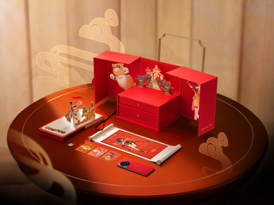除了一加 Ace 2熔岩红,一加 Ace 2 原神定制礼盒还包含了诸多丰富的定制化周边产品。首先,在包装盒中,一加巧妙的结合了人物的故事背景,以香菱厨师世家为灵感,将定制礼盒以「食盒」元素进行展现,配合大面积的红色搭配烫金工艺,以及金属质感与亮面的UV工艺,让整个礼盒看上去更为精致,而在包装盒内,卡针、贴纸、卡片、卷轴到说明画册皆加入了香菱和锅巴的深度定制,不仅提升了整体的美感设计,也让一加 Ace 2 原神定制礼盒变得更有收藏价值。