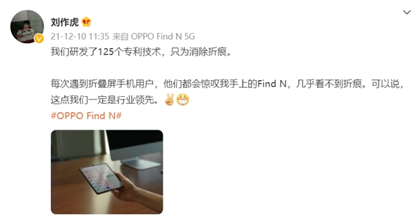 刘作虎还表示,OPPO Find N研发了125个专利技术,只为消除折痕。再通过OPPO官微公布的预热视频来看,Find N展开后,肉眼基本看不到折痕,在视觉体验上相比其他折叠屏产品似乎更顺滑细腻。这也让人更加好奇OPPO都用上了哪些新技术。