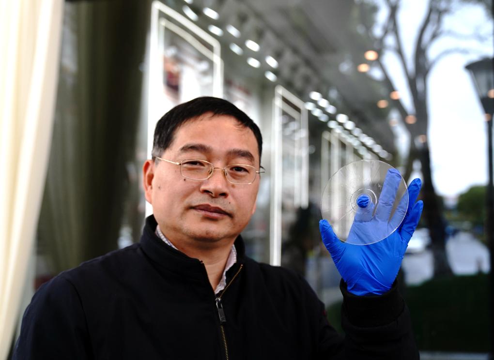 2月21日,上海光机所阮昊研究员展示“超级光盘”。新华社记者张建松 摄