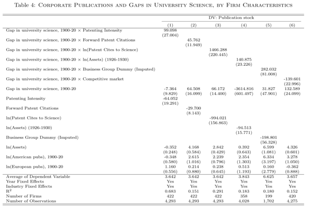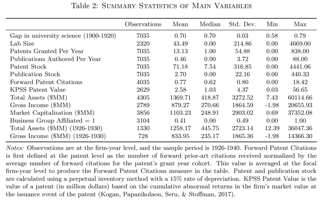 本文以1926-1950年间美国行业金字塔顶尖企业作为样本,合并企业科学出版物(来源为Microsoft Academic Graph (MAG))、工业实验室、企业专利、企业所有权、财务数据和行业集中度数据。作者手工筛选了样本期内在科学研究和技术创新领域中比较活跃的共234家公司,并美国证券价格中心的数据补充了235家公司。样本期间内有201个企业共发表量3194篇文章。作者还手工收集了样本企业设立工业实验室的信息,并以实验室工作人员的数量来衡量企业实验室规模。本文使用专利(数据来源为Google’s public patent dataset)有关的4个指标衡量企业技术创新的能力,分别是专利被引用数据、专利引用论文情况(专利依赖科学研究程度)、专利的新颖度(参考Fleming(2001)的方法计算)和专利市场价值(以企业公布专利导致企业股价上涨的幅度衡量)。
