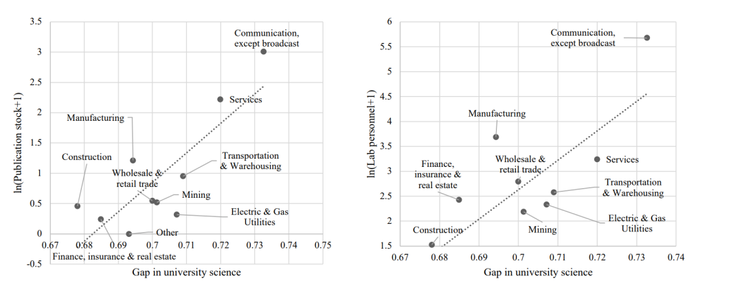 本文作者构建了一个技术领导企业和追随企业的三阶段博弈模型(这里不展开介绍,感兴趣的读者请参见原文)得出,在一定的条件下,在高校科学研究供给不足时,企业自身科学研究投资会提升。此外,根据理论分析,规模较大的企业(需要以来新发明来实现业务增长)、所处行业市场集中度比较高或垄断性行业企业 (因为反托拉斯法的限制,此类企业不能依靠并购等方式实现增长和资源扩张,而只能谋求技术创新实现业务新的增长点;且由于市场集中度足够高,此类企业不需要担心知识溢出问题) 、具有领导势力的企业(需要技术创新来实现领先式发展)对企业科学研究的需求更大,对高校科学研究落后更加敏感。于是,作者构造了一个丰富的数据集来检验这些假设。