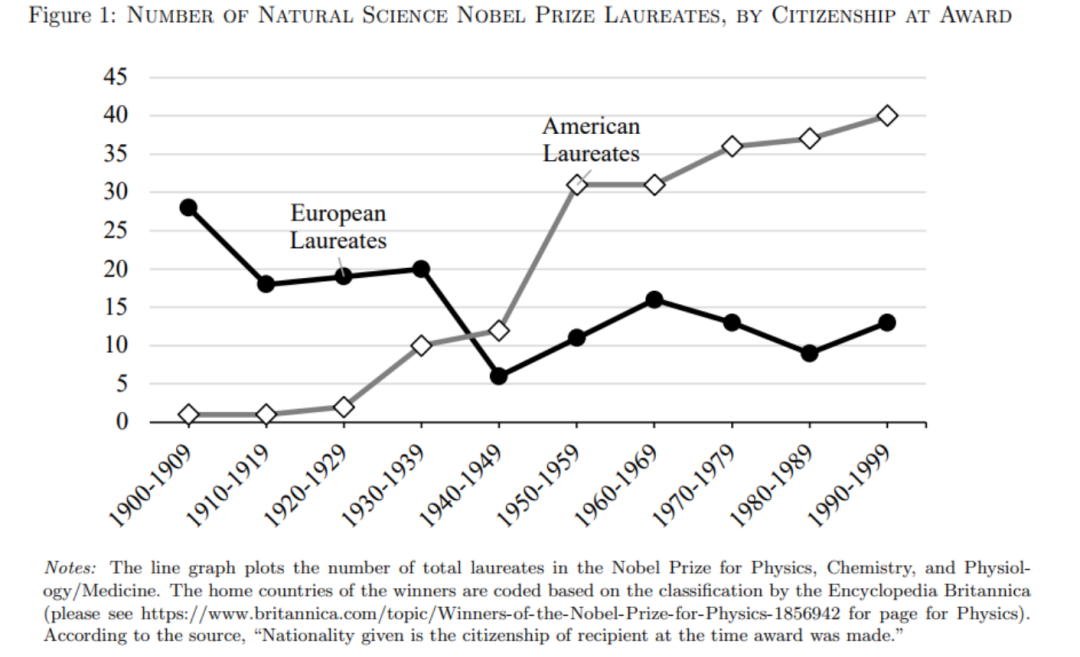 具体而言,一战后美国公司投资科学研究主要有四个原因。第一,获得/保持国际竞争能力(例如,拜耳公司通过有机化学方面的科学研究建立起创新优势,在国际有机合成染料市场上表现很好)。第二,应对来自欧洲竞争的挑战(例如,通用电气公司在照明方面与西屋公司的竞争。通用公司在爱迪生发明的基础上制造高度真空的白炽灯,后来沃尔特发明了一种不需要真空就可以工作的灯泡,而且效率更高,后来西屋公司以此申请了专利。为了与西屋竞争,通用公司建立了通用科研实验室,招募博士高端科研人才与西屋公司打“科研战”)。第三,通过技术 “前沿 “推动技术发展。第四,当时美国的大学不太注重基础研究,并且落后于欧洲的大学(特别是在量子物理和有机化学方面。一战结束时,美国前16名大学的论文出版物数量还不到二战前夕的1/4)。下图报告了美国与欧洲在物理、化学和药学领域诺贝尔奖数量对比情况,可以看出一战结束后和二战开始前美国高校在基础科学研究方面远远落后于欧洲。