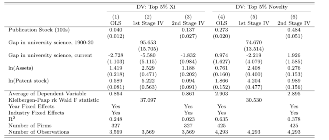 文章还进一步实证检验了企业投资内部科学研究的经济效果。使用下述(2)式估计企业科学研究对企业高市场价值(top 5%)和高创新得分(根据Fleming(2001);top5%)的影响。然而,由于不可观测的遗漏因素,如技术机会、公司质量等,可能同时影响企业科学研究和技术创新绩效,导致(2)式估计结果有偏。为解决该内生性问题,文章使用样本期前的美国与欧洲科学研究差距作为样本期间企业科学研究水平的工具变量。根据前文的分析,相关性显然满足,同时过去的美国与欧洲科学研究差距不太可能影响通过其他渠道或直接当期企业的技术创新或市场价值,因此排他性假设亦得以满足。表4报告了(2)式的OLS和2SLS估计结果。可以得到以下结论:第一,列(1)和列(4)OLS及列(3)列(6)2SLS中企业科学出版物系数均显著为正,表明企业科学研究显著提高了企业高价值专利和创新力得分。第二,第三行报告了“当前”高校科研差距作为控制变量的估计结果,可见当期高校科研差距对企业技术创新会产生不利影响。第三,2SLS估计得到的核心解释变量系数大于OLS结果,一种可能的解释是,企业科学研究对技术创新的影响存在异质性,当内部科学研究特别由公共科学差距引致时,其将成为企业竞争优势更有力的来源,对企业技术创新的影响更大。总之,企业内部科学研究投资确实会为企业带来更有价值的发明成果。类似地文章最后还研究了企业科学研究对企业市场价值(Tobin q)的影响,结果见表5,这里不再赘述。