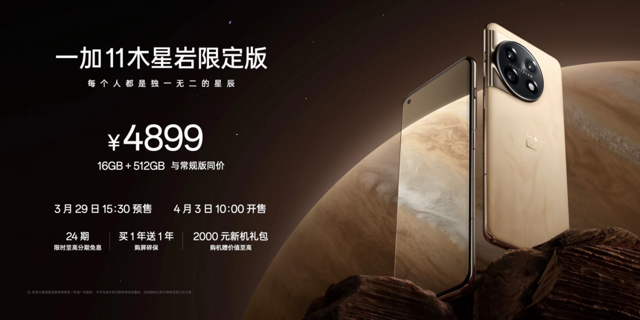 一加 11 木星岩限定版搭载第二代骁龙 8 移动平台,满血版 16GB 大内存,512GB 超大闪存,拥有内存基因重组技术、超帧超画引擎、仿生振感马达、游戏云计算专网四大领先配置,在内存管理、游戏画质、马达体验、弱网游戏上打破安卓四大不可能,带来安卓手机性能体验新巅峰。目前一加 11 木星岩限定版已开启预售,16GB+512GB 顶配 4899 元,至高 24 期分期免息,购屏碎保买一年送一年,4 月 3 日 10:00 正式开售。