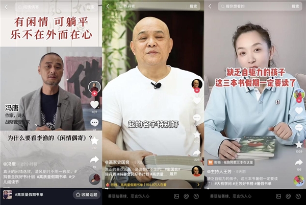 如果你不知道应该去哪些书中“避暑”,不妨来抖音电商看一下大家的#高质量假期书单。在这个话题下面,作家冯唐推荐李渔《闲情偶寄》,倡导“有闲情,可躺平,乐不在外而在心”的生活态度,画家史国良推荐陈丹青《再见吧,速写》,让大家在一张张速写中领略雪意沁脾的西藏风情,主持人王芳为中小学生推荐适合暑假阅读的图书,“王芳好书榜”也特别推出暑期特辑,更有许多普通用户踊跃分享,推荐自己的独家阅读“秘方”。