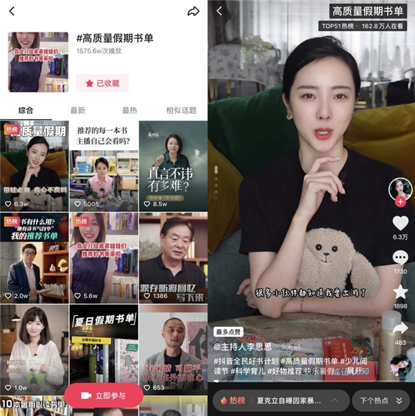 本季“全民好书计划”恰逢暑假期间,正是全国家长、学子选购开学图书的关键时段。如同填报志愿需要专业指导一样,他们同样亟需针对性的购书建议。抖音电商汇聚了成千上万“术业有专攻”的垂类图书达人,正好可以解家长、学生之所急。“全民好书计划”邀请了都靓读书、主持人李思思等抖音创作者,推出了“只有中国孩子才能看懂”“暑假亲子书单”“开学必备好书”等达人书单,让用户可以不用为选购图书而苦恼。
