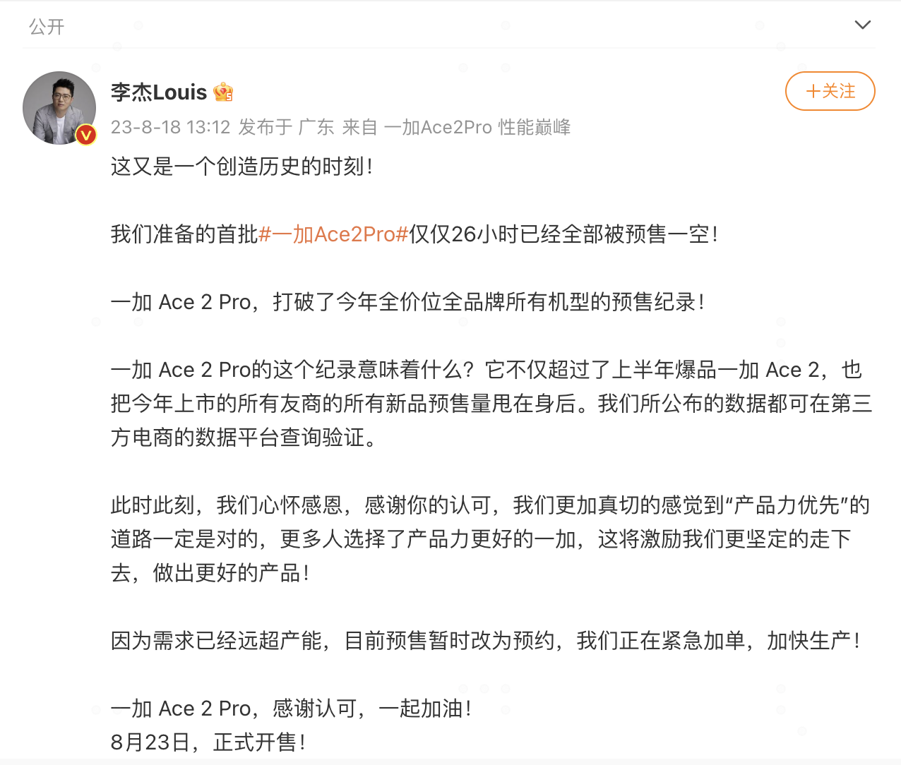 一加 Ace 2 Pro 破纪录的预售成绩不仅意味着它超过了2023年上半年的现象级产品一加 Ace 2,也把今年上市的所有友商的所有新品预售量甩在身后。能够取得这样的成绩离不开强大的产品力支持,一加中国区总裁李杰表示:“我们所公布的数据都可在第三方电商的数据平台查询验证。此时此刻,我们心怀感恩,感谢你的认可,我们更加真切的感觉到‘产品力优先’的道路一定是对的,更多人选择了产品力更好的一加,这将激励我们更坚定的走下去,做出更好的产品!”