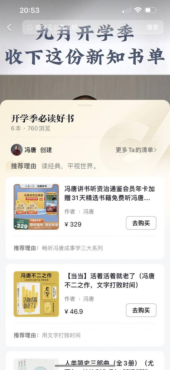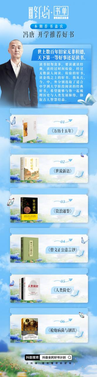 和其他领读人推荐的领域不同,领读人@冯唐 则从古、今、中、外四个角度,分别选出适合中学到大学阶段阅读的《万历十五年》《世说新语》《人类简史》等经典好书,希望能够与读者一起梳理历史与人类发展脉络,撷取古人智慧结晶。