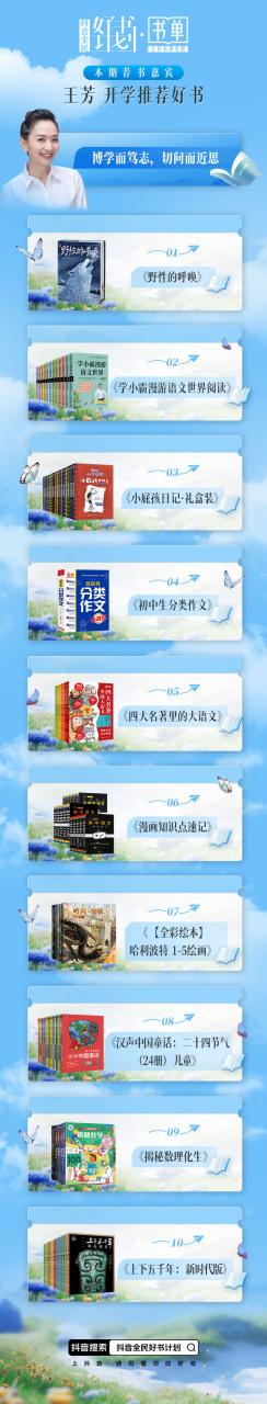 在竞争激烈的育儿赛道,很多家长为了让自己的孩子早早成为“六边形战士”,不管适不适合,什么书都买。但在这次“开学书单”中,由专门的领读人@王芳 特地为家长推荐适合即将开学的中小学生看的书籍,其中不乏《学小霸漫游语文世界阅读》《初中生分类作文》《四大名著里的大语文》等可以辅助孩子课内学习的图书。
