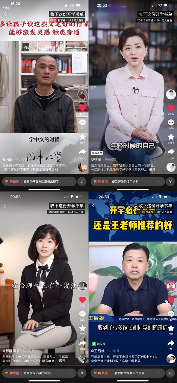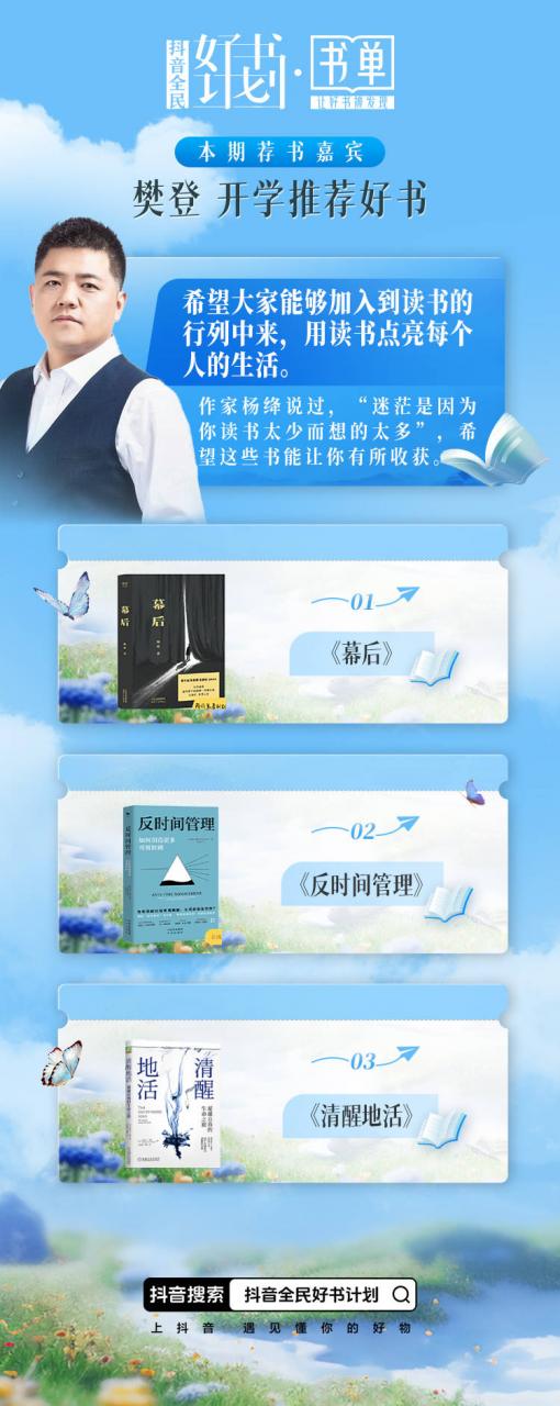 正逢9月开学季,抖音电商特别发起「全民好书计划·万卷书香节」活动, 在线上打造“好书直播间”“开学书单”“品质书店”等板块。此次活动邀请了六位领读人推荐好书,为普通读者快速搭起一座链接书籍的桥梁。