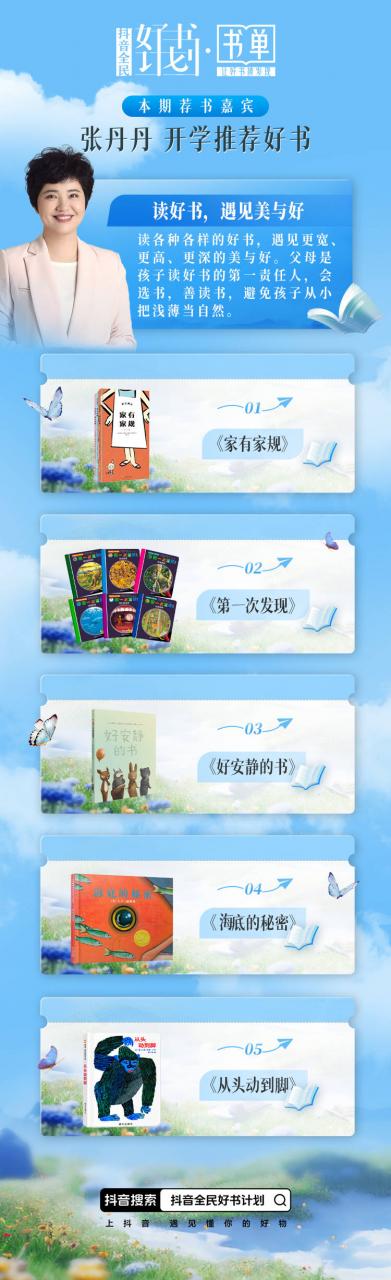 在开学书单中,张丹丹推荐了《家有家规》《第一次发现》《好安静的书》等适合不同年龄段孩子培养阅读习惯的图书。“带孩子读好书,遇见美和好,带孩子读各种各样的好书,遇见更高、更宽、更深的美和好。”