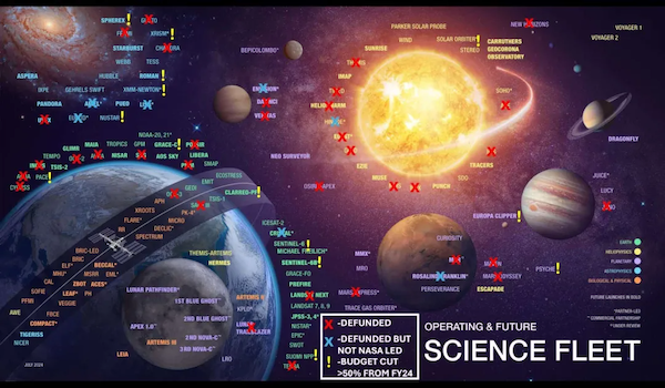 在看到Laura Lopez的图后,又有更多科学家获得了灵感,在更广阔的范围上画出了特朗普预算削减对NASA科学项目产生的影响。在亚利桑那州立大学的天体物理学博士生Skylar Grayson制作的图解中,红色叉号表示该任务不再会获得资金支持,任务将完全终止。蓝色叉号表示这些任务将不再会会的NASA的资金支持,转而由其他机构/组织牵头,理论上这些任务还有机会继续延续下去。黄色感叹号则表示,这些任务接下来能获得的预算,将降低到2024财年的50%以下。