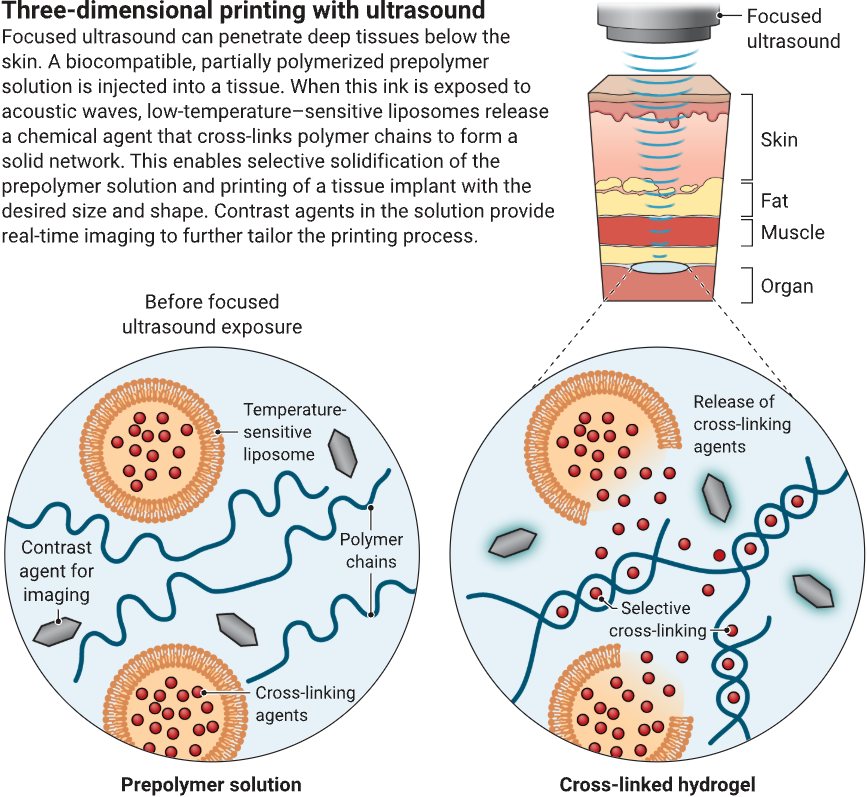 因此,要想真正实现更深层组织中的在体3D打印,并推动这项技术走向临床应用,还需要一种穿透力更强且没有副作用的手段。为此,高伟团队选择了聚焦超声(FUS),这是一种能将高频(>2 MHz)声波精准聚焦于特定点位的方法。借助FUS,他们能将超声波能量传导至皮下几厘米甚至更深的区域,从而显著拓展了3D打印在体内的应用范围,也提升了空间精度。