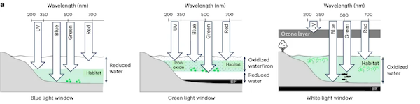 他们推测,起初地球大气里缺乏氧气,也没有臭氧层过滤紫外线。因此,蓝藻等最早的光合自养生物只能生活在远离海面的较深区域,以躲避紫外线的伤害。而当时,地球海洋中含有大量的亚铁离子,它们来源于海底热泉(hydrothermal vent)系统。随着最早的蓝藻等生物开始进行光合作用产生氧气,海洋中的亚铁离子逐渐被氧化为氢氧化铁颗粒。