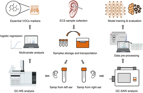采样时,研究人员使用蘸有生理盐水的消毒棉签,在受试者的外耳道轻轻旋转擦拭了两三次,然后分别用两种方法检测了样本:气相色谱–质谱联用技术(GC-MS)和气相色谱–声表面波技术(GC-SAW)。