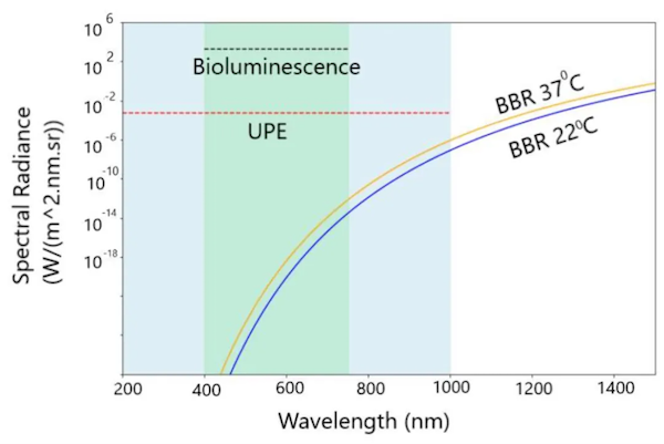 图片显示了生物发光、超微弱光子辐射和黑体辐射的辐射强度和所处的波长范围 图片来源于论文