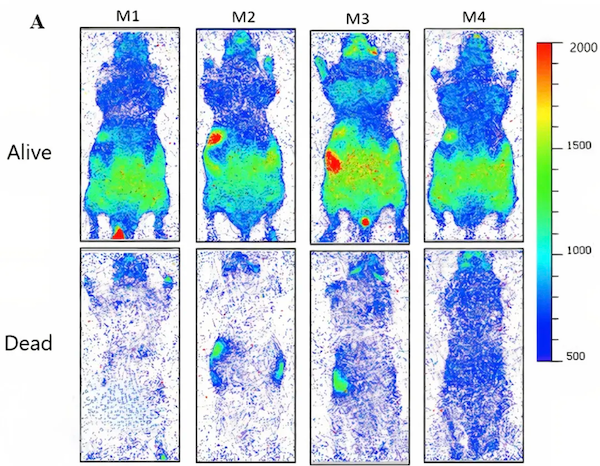 活体小鼠和安乐死后小鼠的UPE成像 图片来源于论文