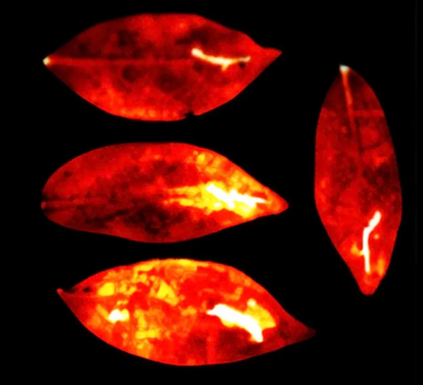 图片中为鹅掌藤,左边从上到下,依次为经过酒精、过氧化氢和苯佐卡因处理过的鹅掌藤,右边为对照。4片叶子的损伤部位都明显更亮。图片来源于论文