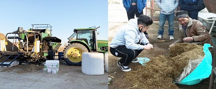 葡萄枝叶微贮饲料加工(左)农民使用情况(右)