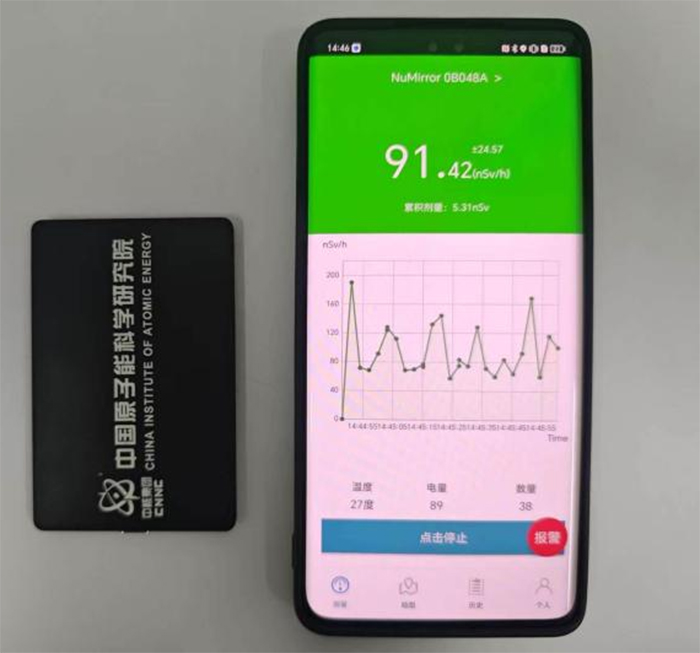 我们研制的无线磁吸辐射探测卡片,大小与公交卡接近,可与磁吸式贴在手机背面与手机无线直连,结合团队开发的软件,可实现辐射测量和数据显示,实现人员经过所有位置的辐射数据地图的绘制,同时也可以作为单独挂件进行辐射探测。