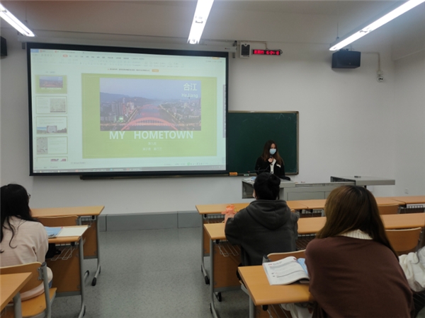 (图片说明:四川传媒学院数媒专业学生用英语在课堂上介绍家乡文化。)